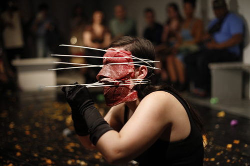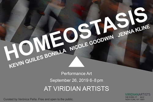 "HOMEOSTASIS" is a curatorial Performance Art project that highlights the work of artists who, by bodily reacting to violence, inequality, racism, rooted stereotypes, hypocrisy, the perfect, and the negative, contribute towards the opposite generating a more balanced, open, and just society. In its medical definition, Homeostasis describes a healthy state sustained by constant biochemical and physiological adjustments that happen between elements within an entity in order to achieve equilibrium, and preserve its existence. Overcoming obstacles, and working towards freedom, the positive, and the transparent, the live realities created by the showcased artists publicly challenge personal, social, and political disequilibrium in pursuit of a healthier system and a more harmonious state of being. The first enactment of Homeostasis presents the work of artists KEVIN QUILES BONILLA, NICOLE GOODWIN, and JENNA KLINE.
