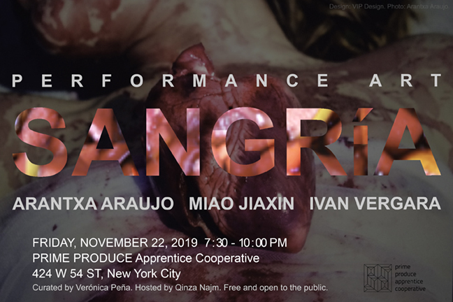"SANGRíA” explores human unity and the experience of life through the topic of blood, “sangre” in Spanish. Besides the well-known sweet Spanish alcoholic drink made of fruits and wine, SANGRíA also means the extraction of blood, the act and effect of bleeding, and the mess caused by the act of killing. SANGRÍA (san-gree-uh) is a word that may suggest sweetness and pleasure, at the same time that evokes hard, threatening images in connection with blood. This duality inspires the first event of the series, presenting the work of artists: ARANTXA ARAUJO, MIAO JIAXIN, and IVAN VERGARA.