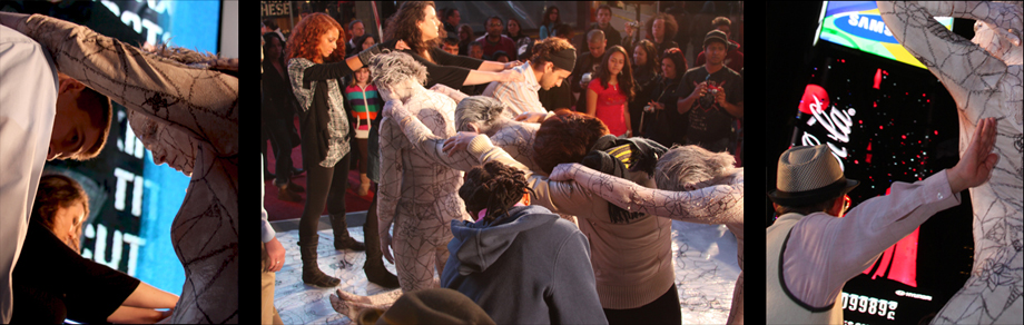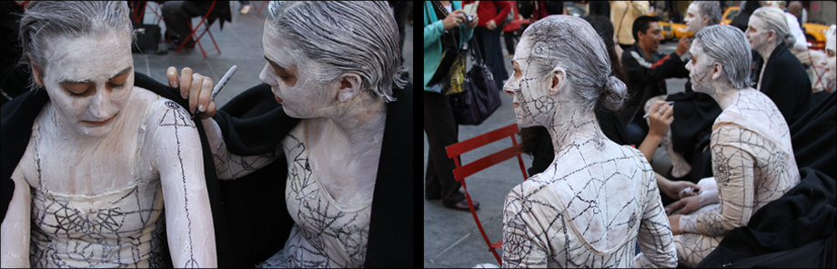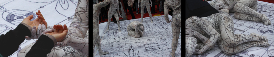Mirror Eyes is an interactive performance that creates shared moments amongst strangers. Dressed in a costume that involves the performer’s body enmeshed within a skin of white mosaic, the performers meet over a platform, also suggestive of white mosaic, and adopt still poses forming sculptural groupings. The poses, which are thought to assume ideal, questionable, and accepted social behaviors, explore notions of togetherness. The audience is invited to join the sculptural groupings by mimicking the postures adopted by the performers. During the poses, the patterns over the performer’s body and on the platform merge together, evoking the disappearance of the performers. The participant members from the audience appear then, as a landscape of bodies engaged on a silent connectedness.